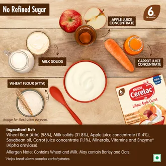 Nestle CERELAC Wheat Apple Carrot with NO Refined Sugar and NO Preservatives, NO Colours, NO Flavours is a complementary baby food for infants from 6 to 24 months. It is also a source of 15 nutrients, including vitamins and minerals. With Iron, Protein, Calcium, ALA (Omega 3) & Vitamin D. This baby food cereal is packed with the goodness of cereal, milk, fruit & vegetable.
